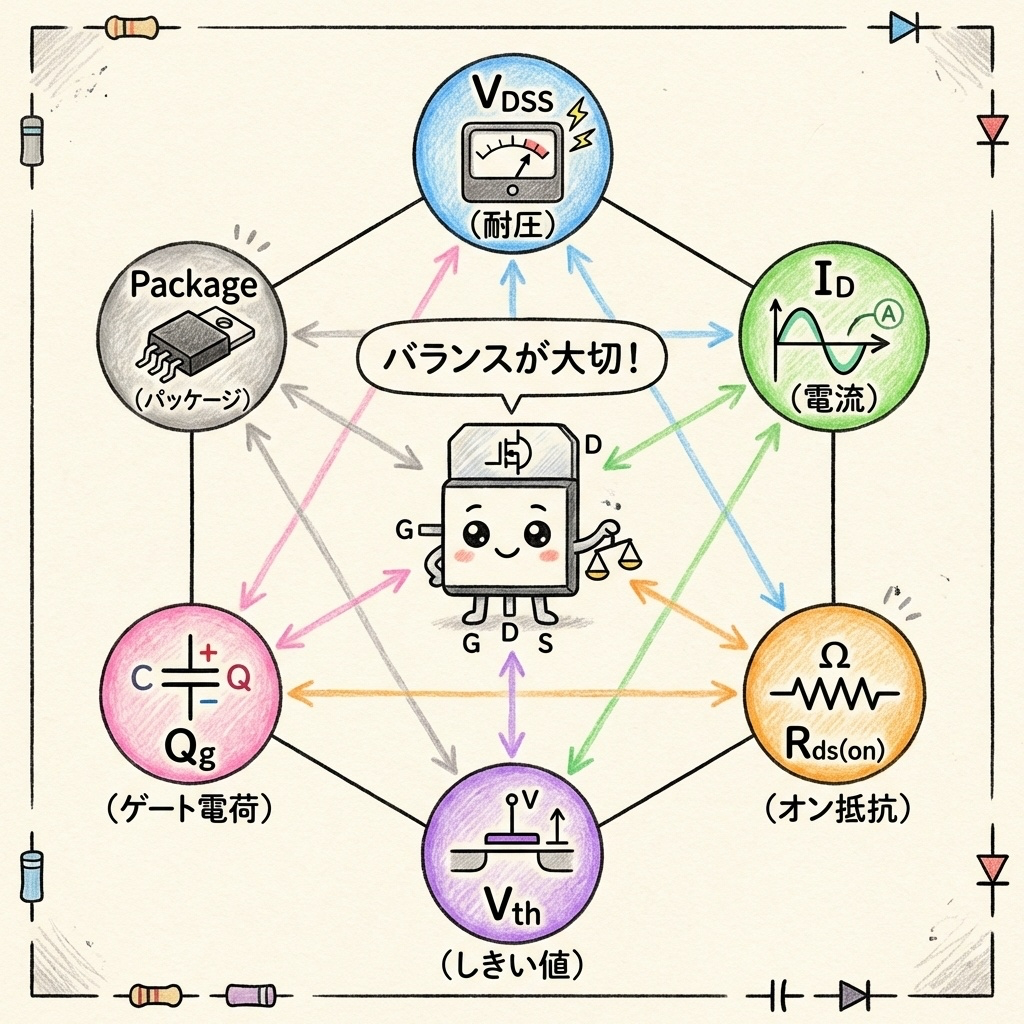MOSFETの選定は、これらのパラメータのバランスが重要です。すべてを最高にすることはできないため、用途に応じて優先順位をつけましょう。