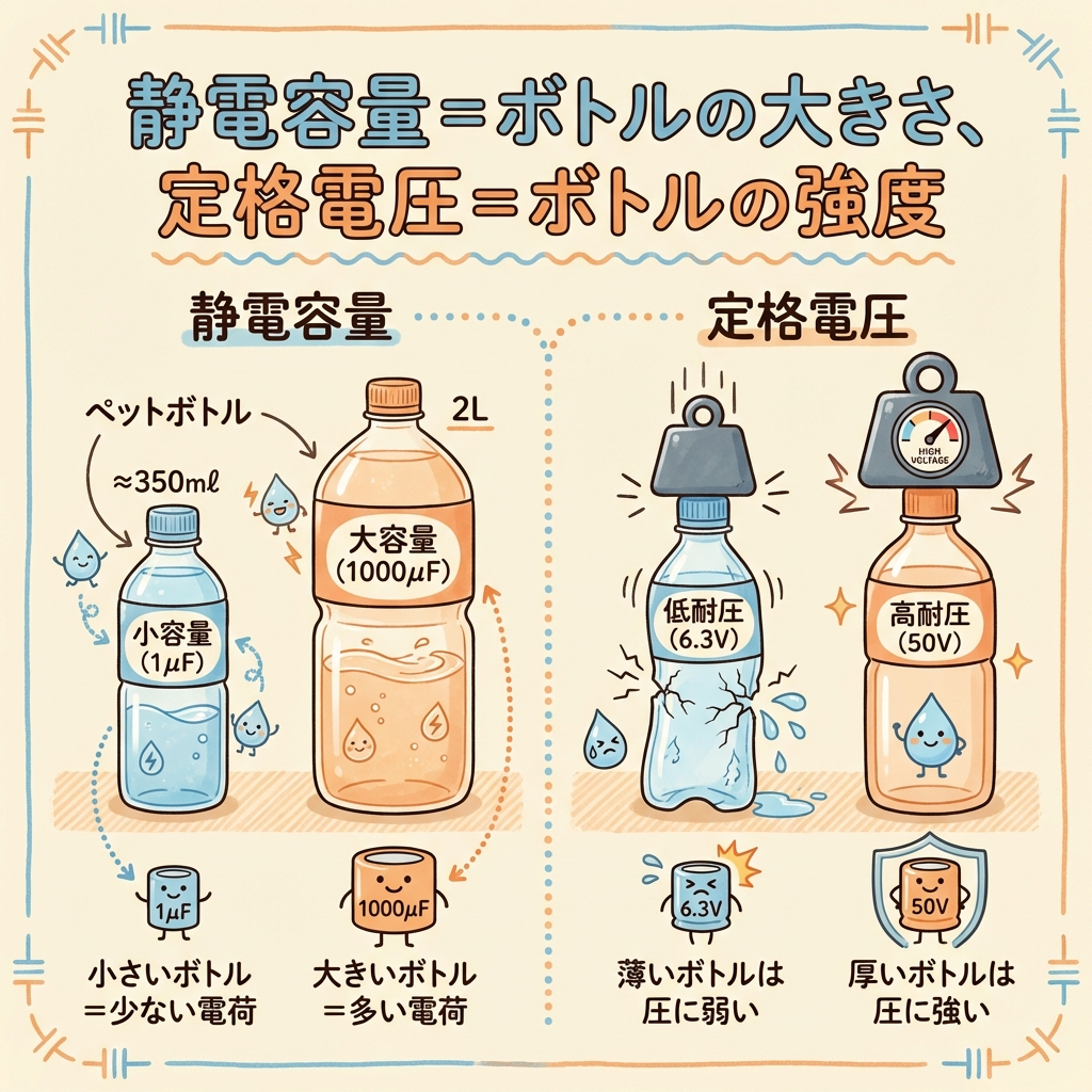 - 🧱 定格電圧(V)= ペットボトルの強度。超えると壊れる。ディレーティング必須