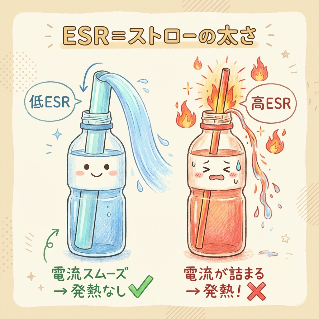 たとえるなら、ペットボトルに刺したストローの太さ。ストローが太ければ水がスムーズに出入りしますが(ESR低い)、細いストローだと水がなかなか出てこない上に、無理に流すとストローが熱くなります(ESR高い)。