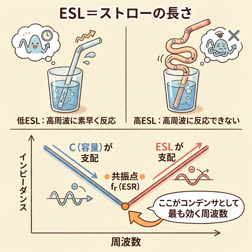たとえるなら、ストローの長さ。短いストローなら水をサッと吸い出せますが、長いストローだと水が出てくるまで時間がかかります。ESLが大きいと、高周波の電流に対してコンデンサが「反応できない」状態になります。