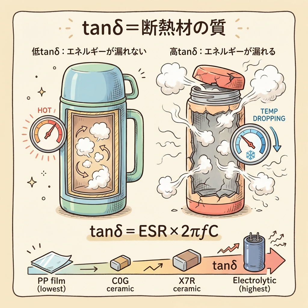 たとえるなら、保温ポットの断熱材の質。断熱材が優秀なポットは、お湯を入れておいてもなかなか冷めません(tanδが小さい)。断熱材がダメなポットはすぐ冷めます(tanδが大きい)。