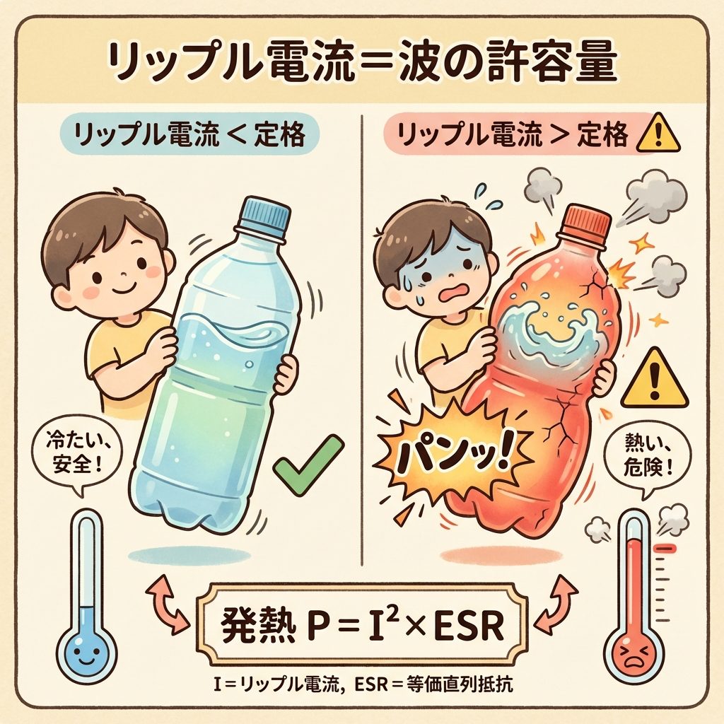 たとえるなら、ペットボトルを揺らしたときの「波」。穏やかに揺らす(リップル電流が小さい)程度なら問題ありませんが、激しく揺さぶる(リップル電流が大きい)と、ペットボトルが熱くなり、最悪壊れてしまいます。