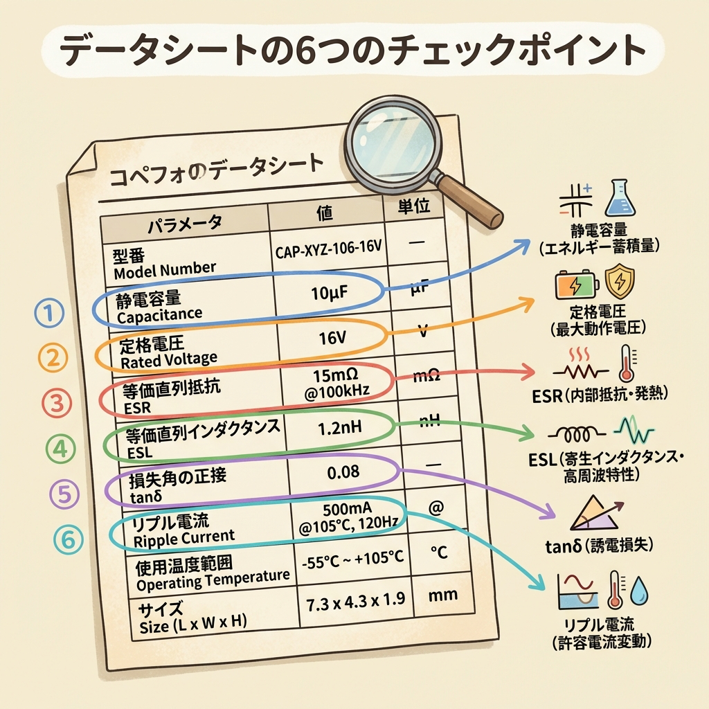 でも実は、コンデンサの選定で最低限チェックすべきパラメータはたった6つしかありません。この6つを理解するだけで、データシートの8割は読めるようになります。