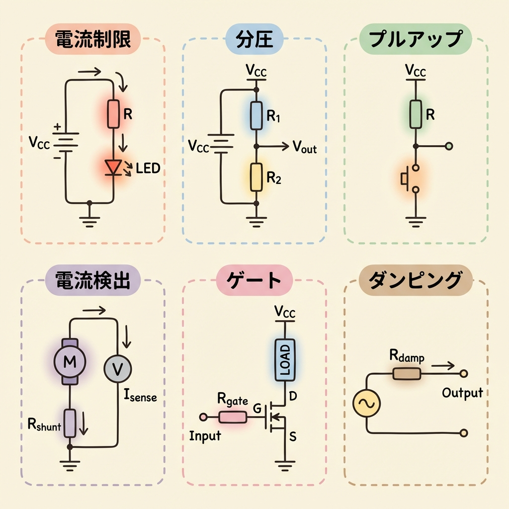 → 電流制限?分圧?プルアップ?電流検出?ゲート駆動?ダンピング?