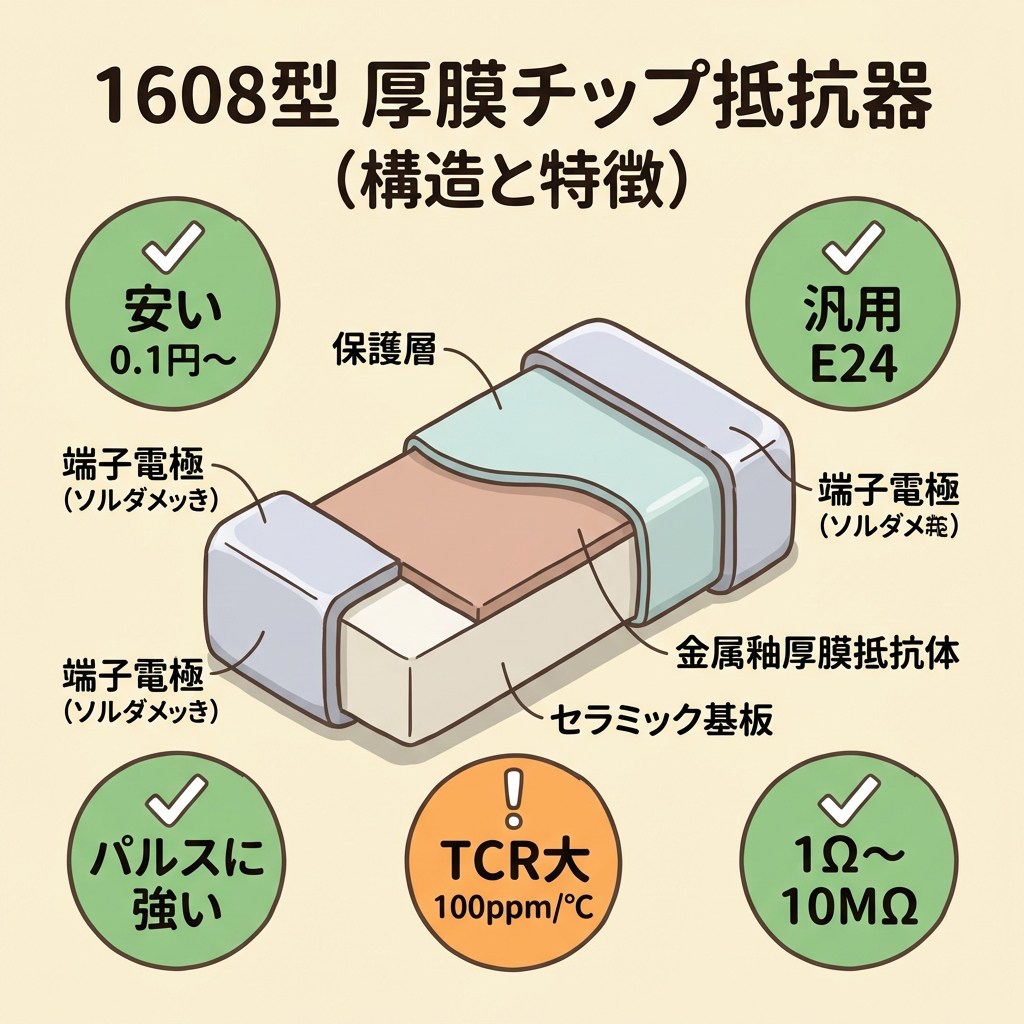 コスト(目安) ◎ 最安(0.1〜0.5円/個) △ 厚膜の2〜5倍 △ 厚膜の5〜20倍