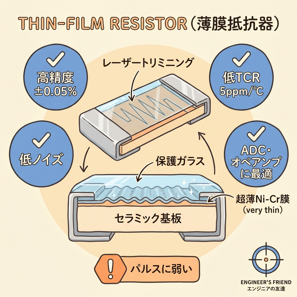 YES:🔵 薄膜チップ抵抗(オペアンプ帰還、精密分圧、ADC基準)