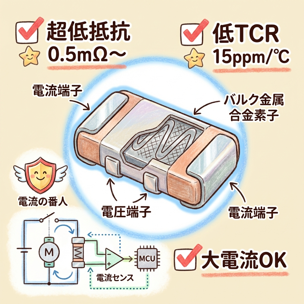 金属板チップ抵抗は、この3つの条件をすべて満たす唯一の存在です。KOAの「TLRシリーズ」やROHMの「PMRシリーズ」が代表的な製品です。