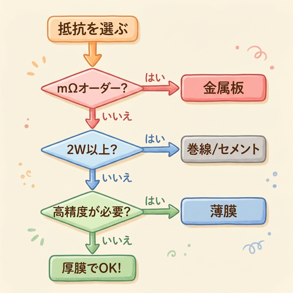 用途別フローチャート ── 「結局どの抵抗?」を即決する