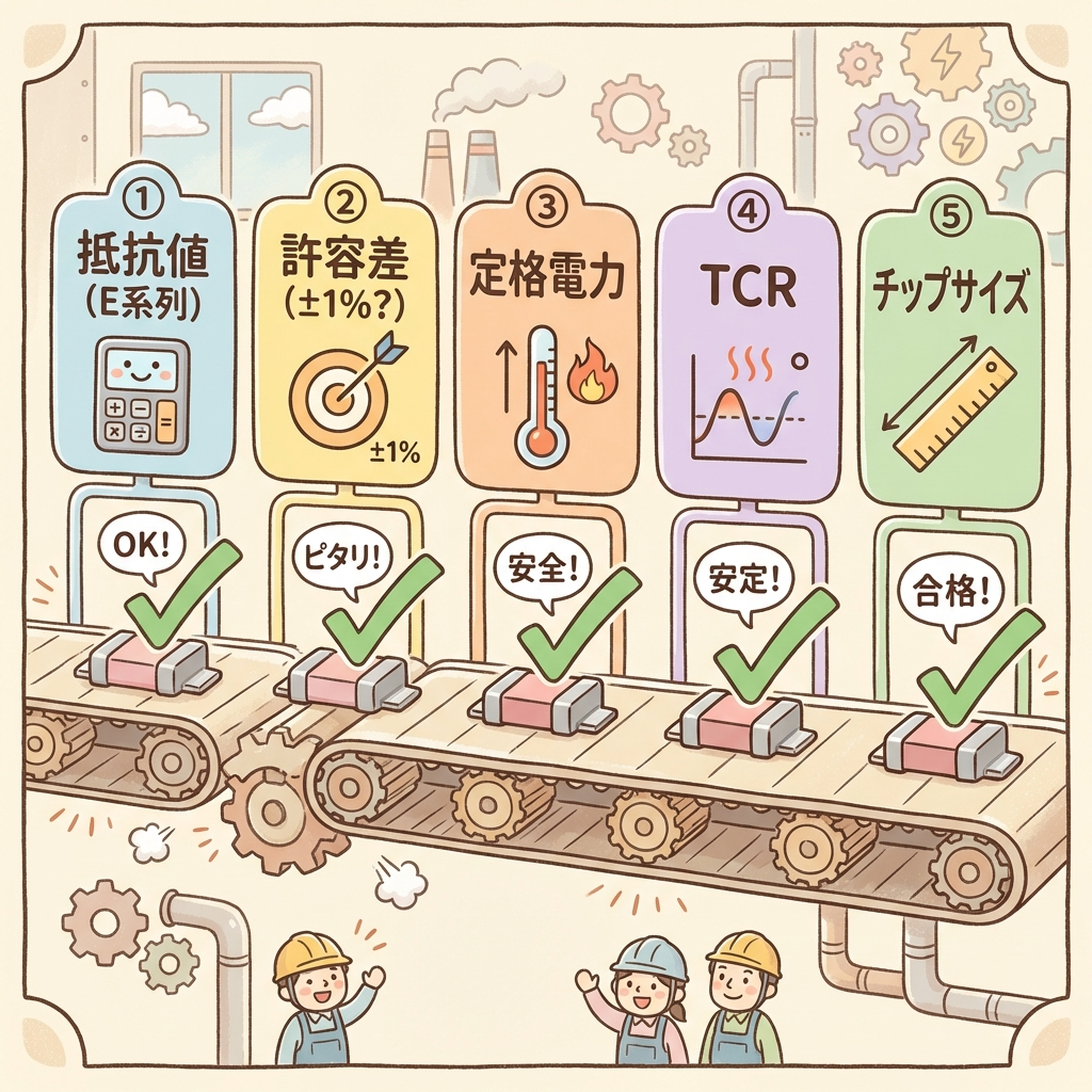 → 抵抗値(E系列)→ 許容差 → 定格電力 → TCR → チップサイズ
