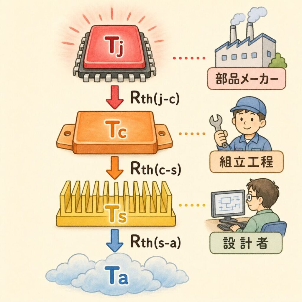 - 各熱抵抗が「誰の責任範囲」なのか(部品メーカー/組立工程/放熱設計)が明確になる