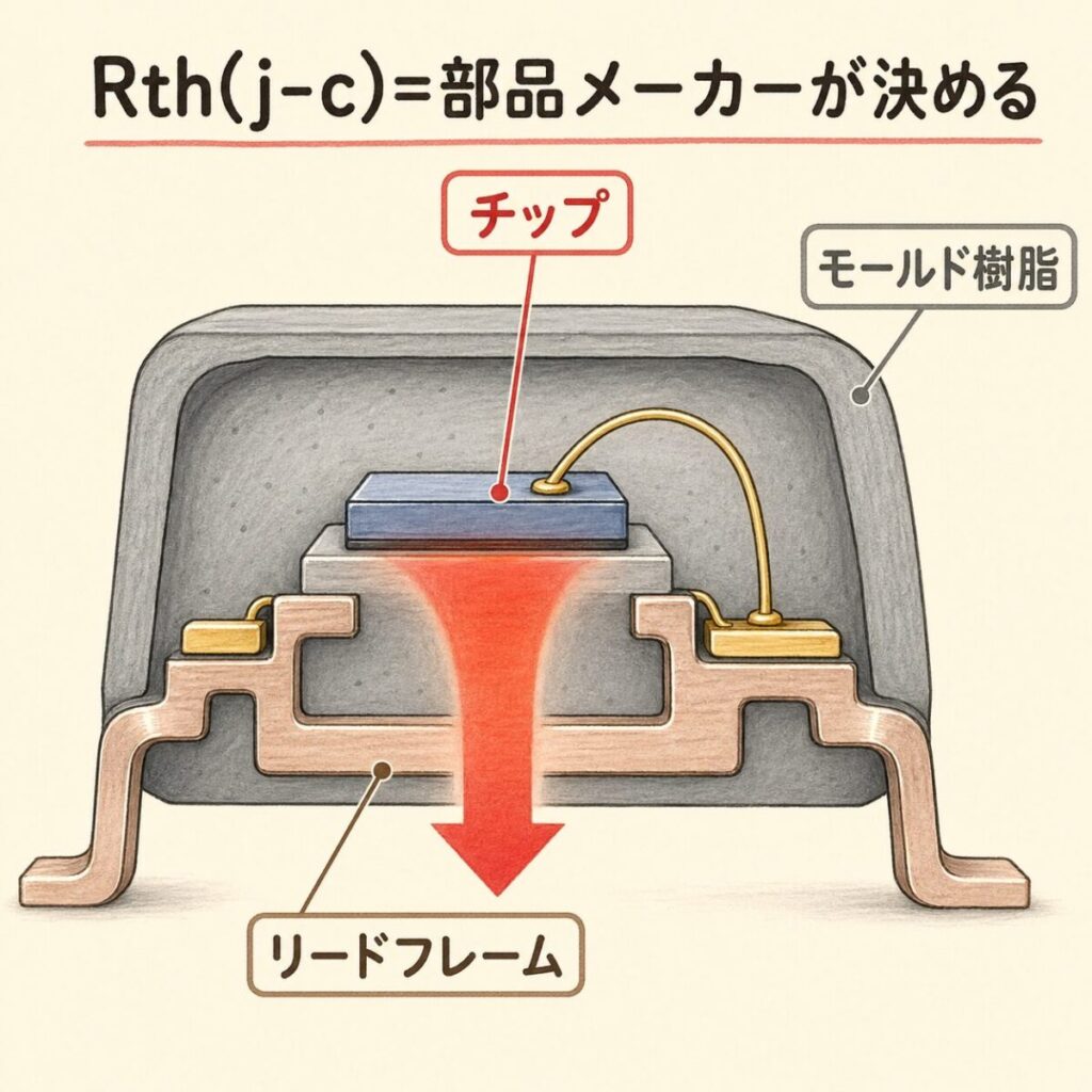 Rth(j-c)は部品メーカー(半導体メーカー)の責任範囲です。パッケージを開けて中身を変えることは、ユーザー側ではできません。データシートに記載された値を信頼して使うしかなく、変更したければ「もっと熱抵抗の小さいパッケージの部品を選ぶ」しかありません。