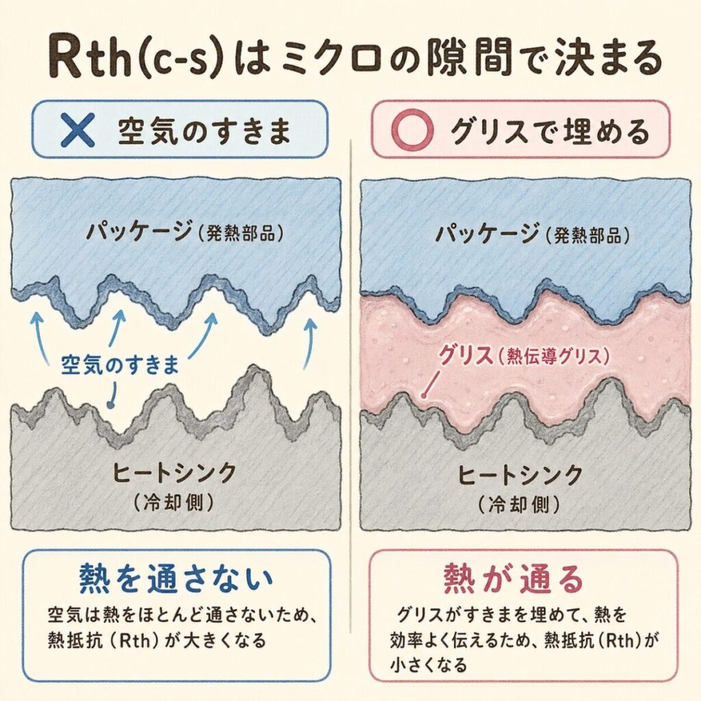 Rth(c-s)はケース(パッケージ表面)からヒートシンクまでの熱抵抗です。3つの熱抵抗の中で最も「人為的なミス」が出やすく、熱トラブルの最大の原因になりやすい場所です。