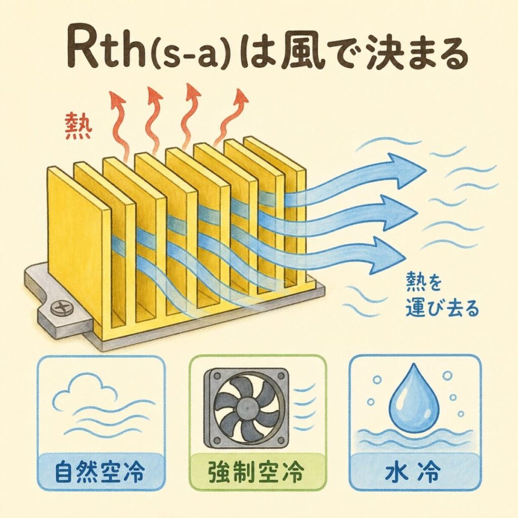 - Rth(s-a):ヒートシンク→空気。放熱設計の責任。ヒートシンク・冷却方式で決まる