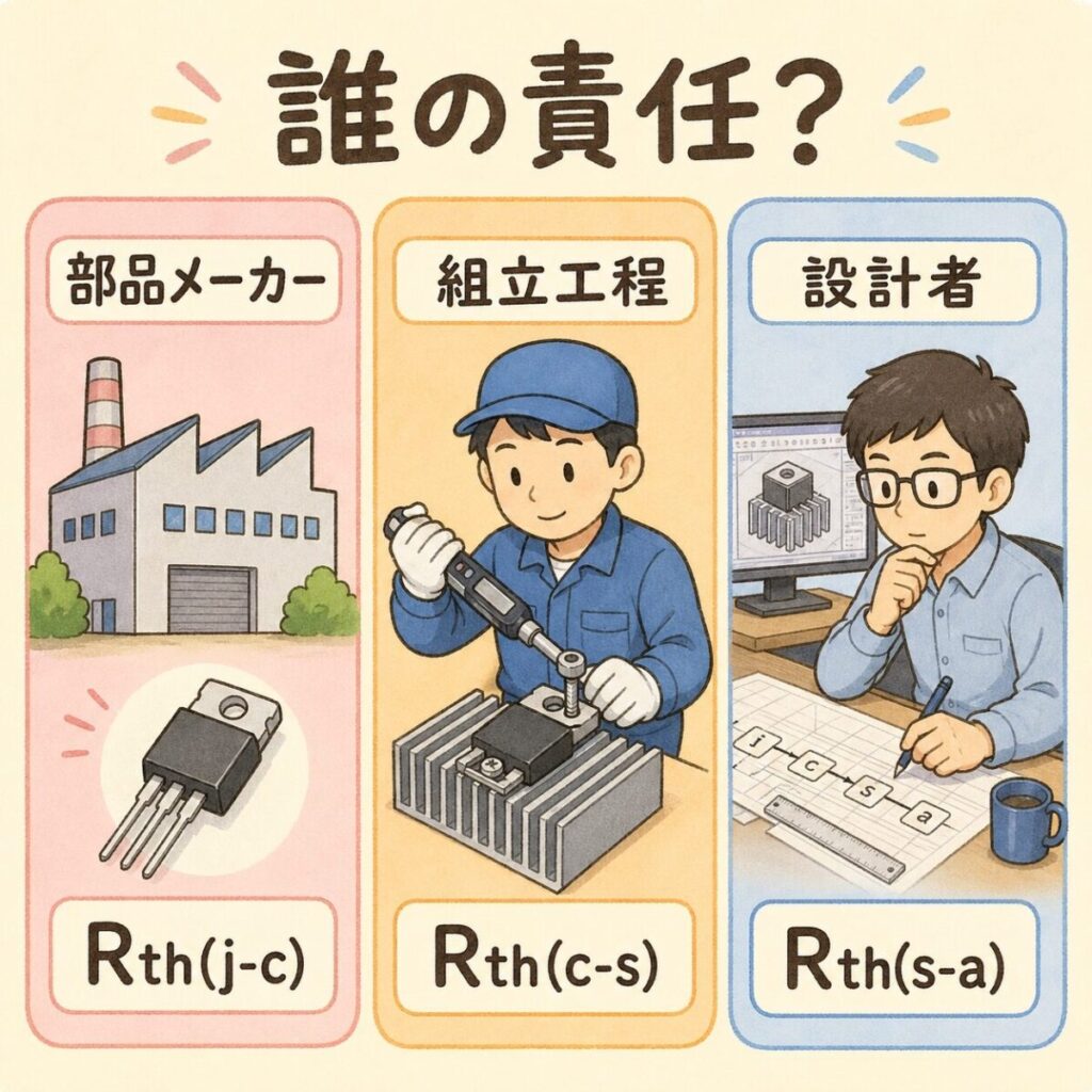 この記事を読み終えると、客先監査で「ここの熱抵抗は誰が保証しているんですか?」と聞かれても、堂々と答えられるようになります。結論を先に言います。Rth(j-c)は部品メーカーの責任、Rth(c-s)は組立工程の責任、Rth(s-a)は放熱設計の責任です。