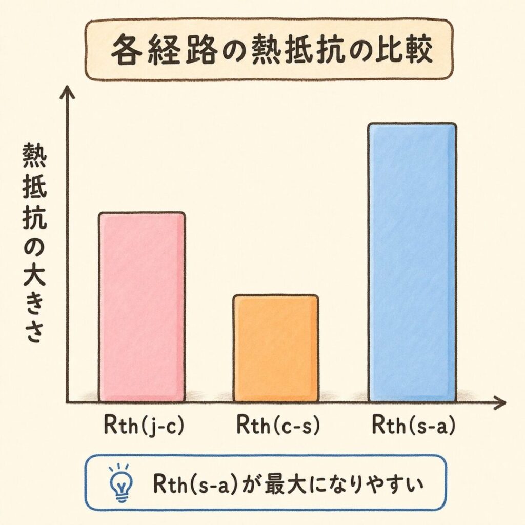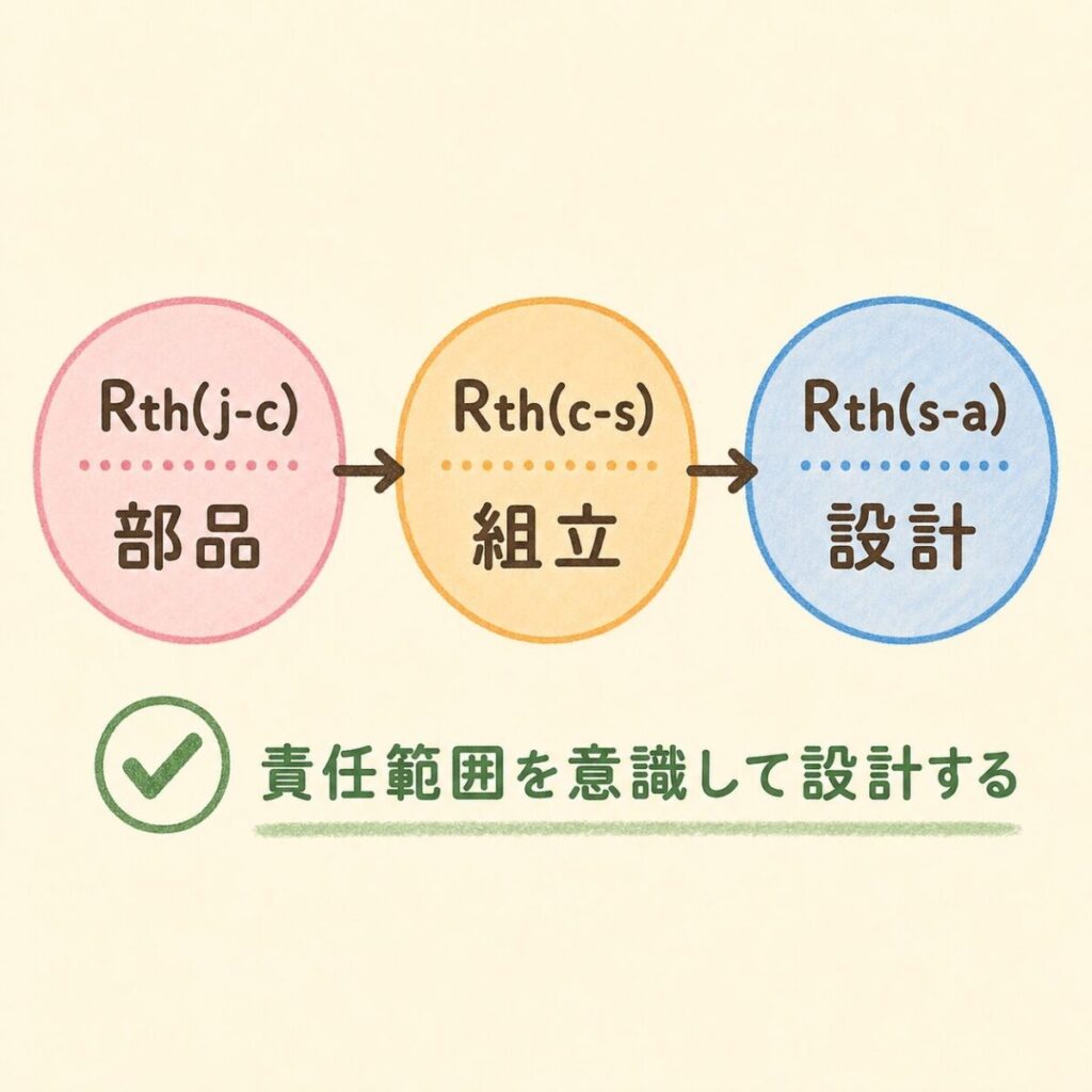 - Rth(j-c)・Rth(c-s)・Rth(s-a)の3つが「どこからどこまでの熱抵抗か」を直感で理解