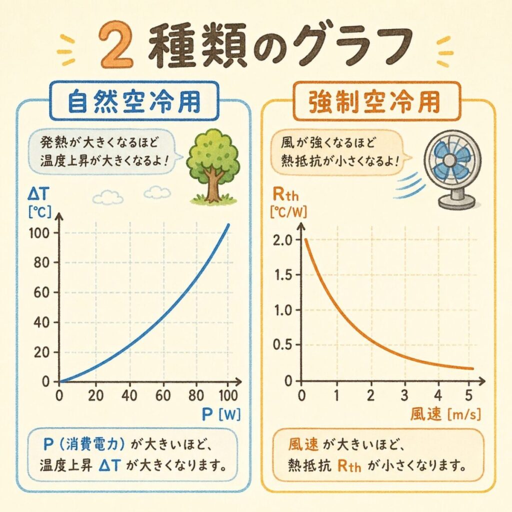 2つのグラフは「使い分け」です。設計する機器が自然空冷か強制空冷かで、見るべきグラフが決まります。両方を比較する場面はあまりありません。