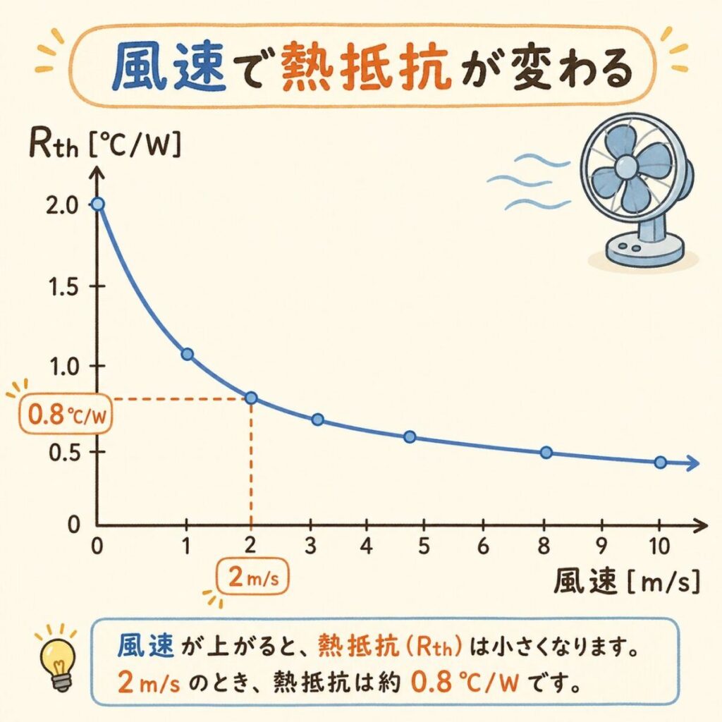 このように、風速の違いだけでTjが50℃以上も変わるのがわかります。グラフから正しく読み取れるかどうかが、熱設計の成否を分けるのです。