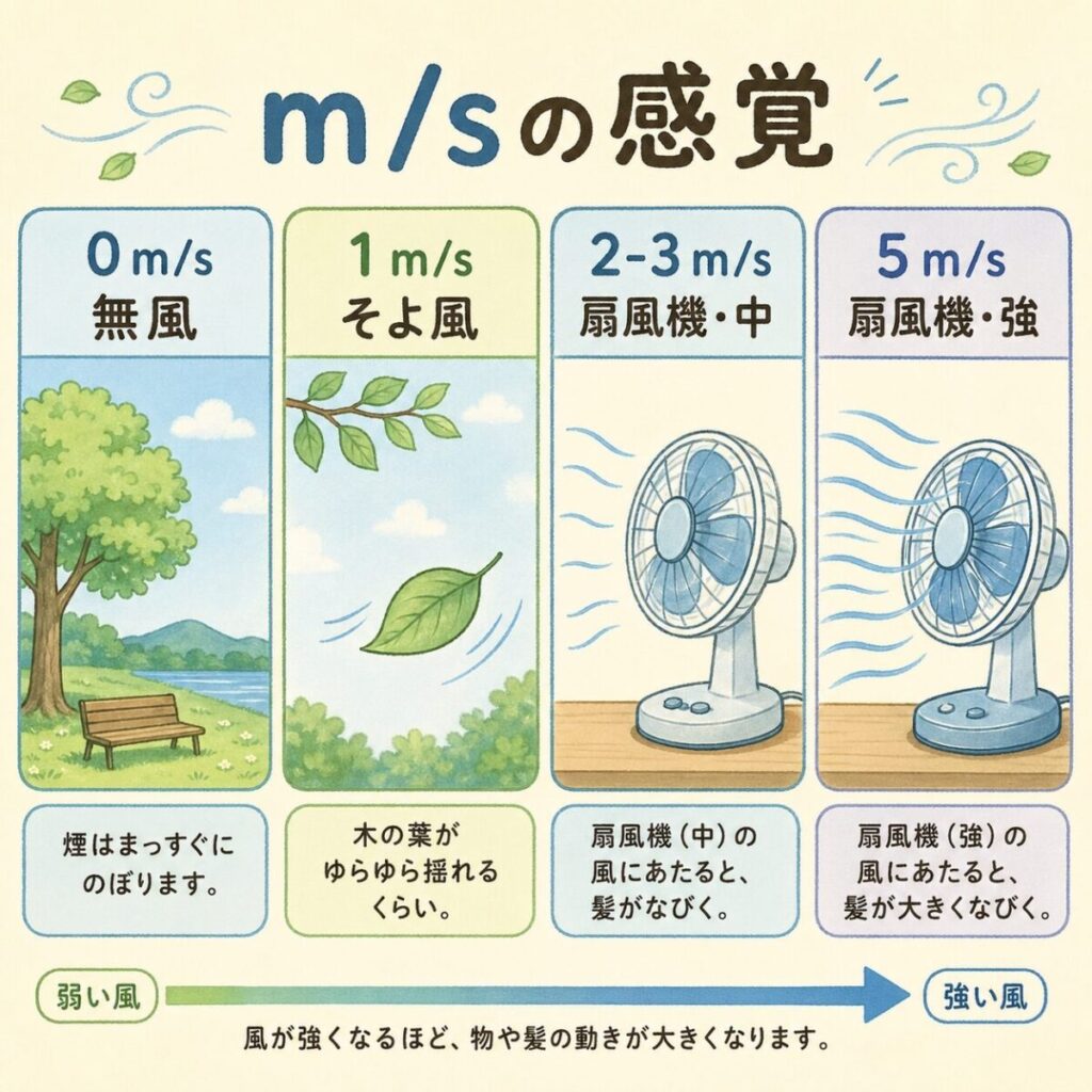 グラフの横軸でよく出てくる「m/s(メートル毎秒)」は、空気が1秒間に何メートル進むかを示す単位です。日常生活で言えば、扇風機の「弱」が約1 m/s、「強」が約3〜4 m/s程度のイメージ。