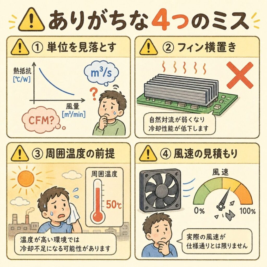 データシートのグラフは「フィンが縦置き(最適配置)」での値です。横置きにすると性能は30〜50%劣化することもあります。実機での取付方向を確認しましょう。