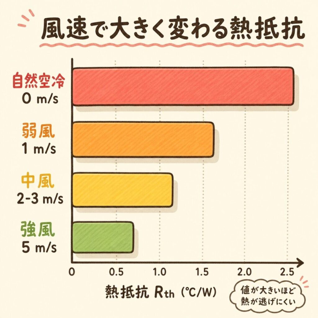 ファンのカタログ値(最大風量)から計算した風速をそのままグラフに当てはめるのは危険。実機ではフィンや周囲部品の抵抗で風速が落ちるため、カタログ値の70%程度で見積もるのが安全です。