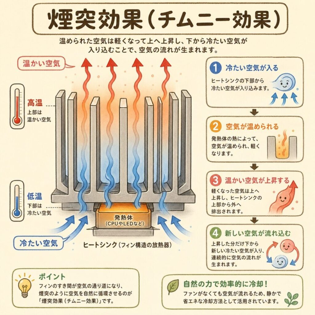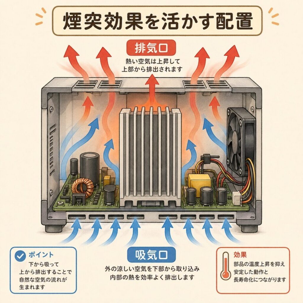 この「下から上への空気の流れ」を煙突効果(チムニー効果)と呼びます。煙突から煙がスーッと上に抜けていくのと同じ原理です。自然空冷の冷却性能は、この煙突効果をどれだけ邪魔せずに作れるかで決まります。