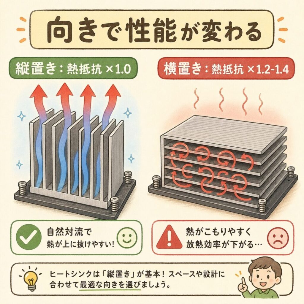 実は、自然空冷のヒートシンクは設置する向きを間違えるだけで冷却性能が30%以上低下します。データシートに書かれている熱抵抗値は、あくまで「正しい向き」で使った場合の数値です。