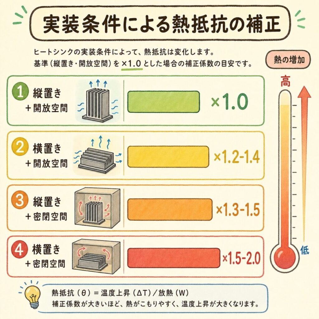 ヒートシンクメーカーのカタログに記載されている熱抵抗値(℃/W)は、ほとんどが「縦置き・無風状態」での測定値です。横置きで使うと、この値より20〜40%悪化することを必ず織り込んで設計してください。