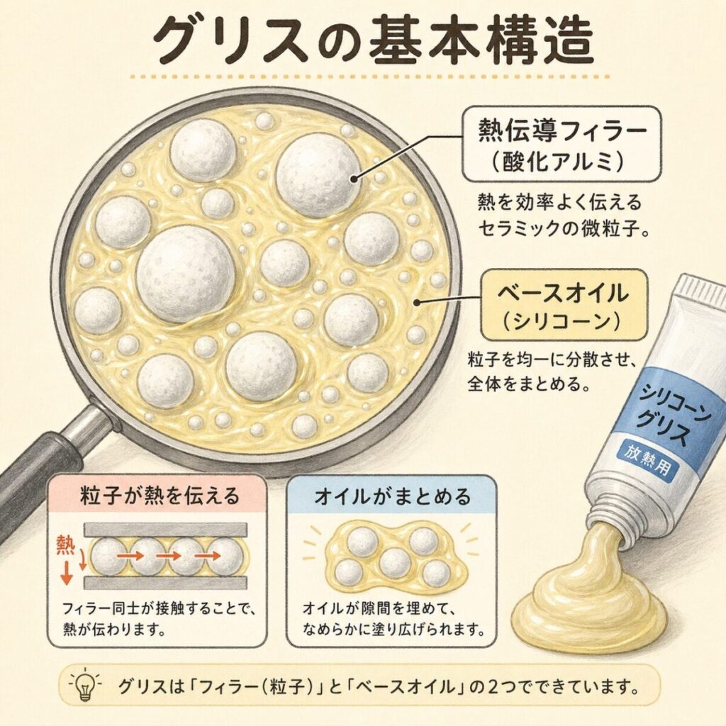 まずは熱伝導グリスが何でできているかを理解しましょう。グリスはおおまかに「ベースオイル」+「熱伝導フィラー」の2つの要素で構成されています。