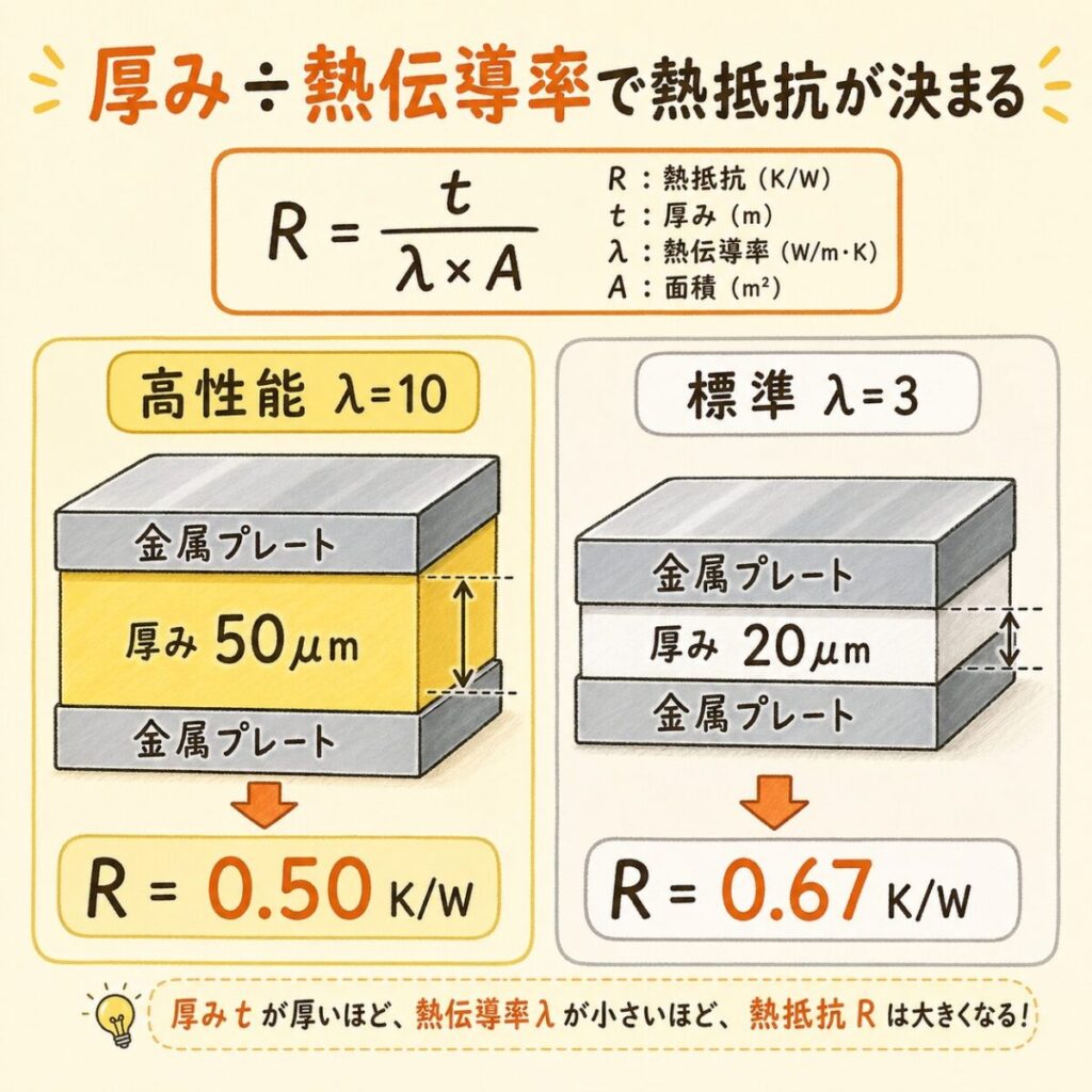 理由①:実際の熱抵抗は「厚み÷熱伝導率」で決まる
