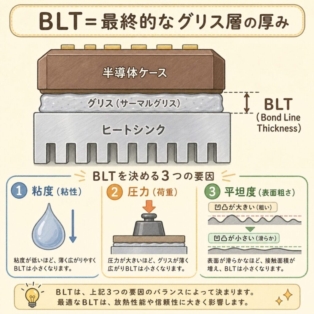 熱設計の世界にはBLT(Bond Line Thickness)という重要な指標があります。日本語では「接着層厚み」。グリスを塗って締め付けた後、最終的に部品とヒートシンクの間に残るグリス層の厚みのことです。
