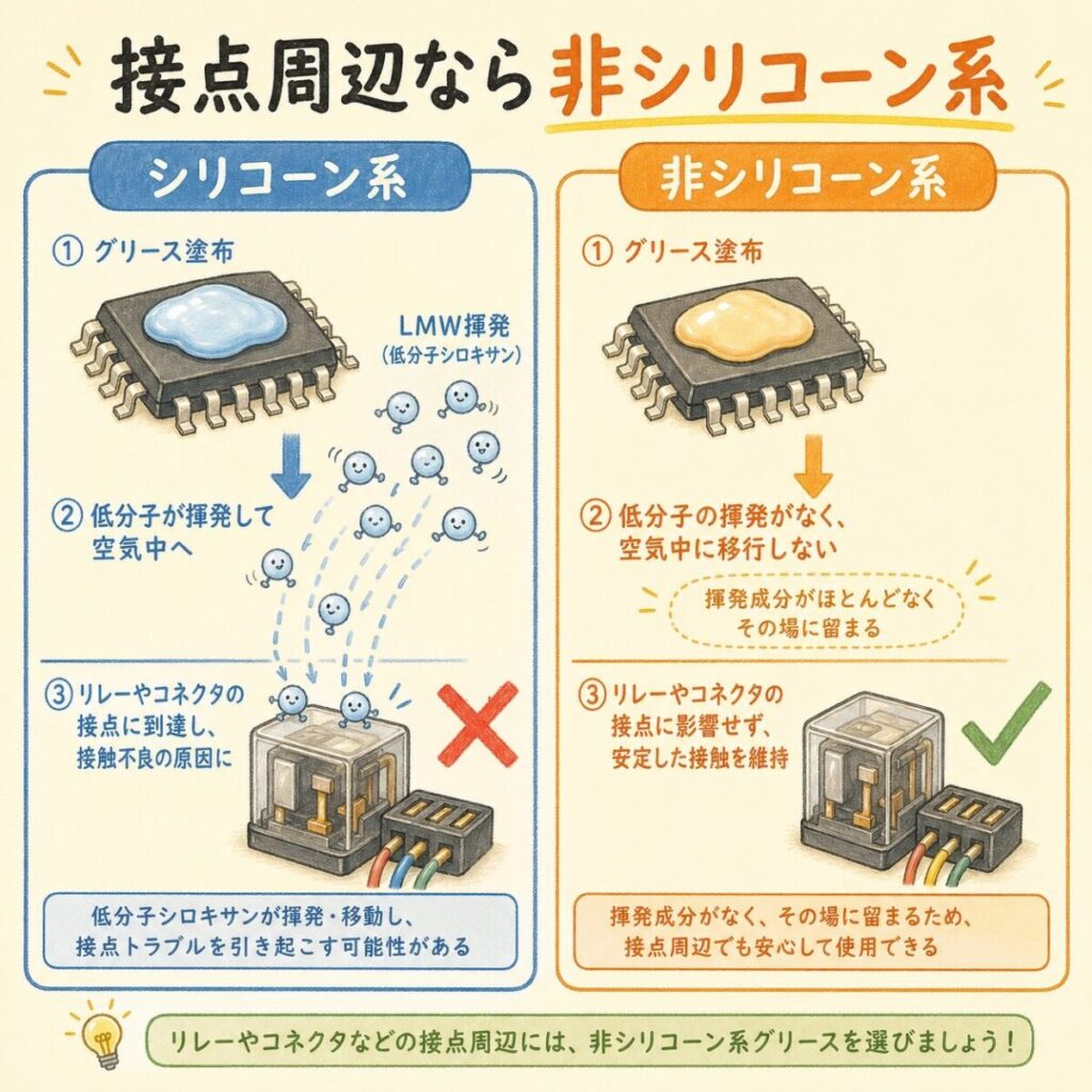 パワエレ機器でリレーや機械式コネクタが内部にある場合、非シリコーン系グリスまたは低LMWタイプのシリコーン系を選ぶのが安全策です。車載・産業機器・通信機器ではこの問題が重要視されます。