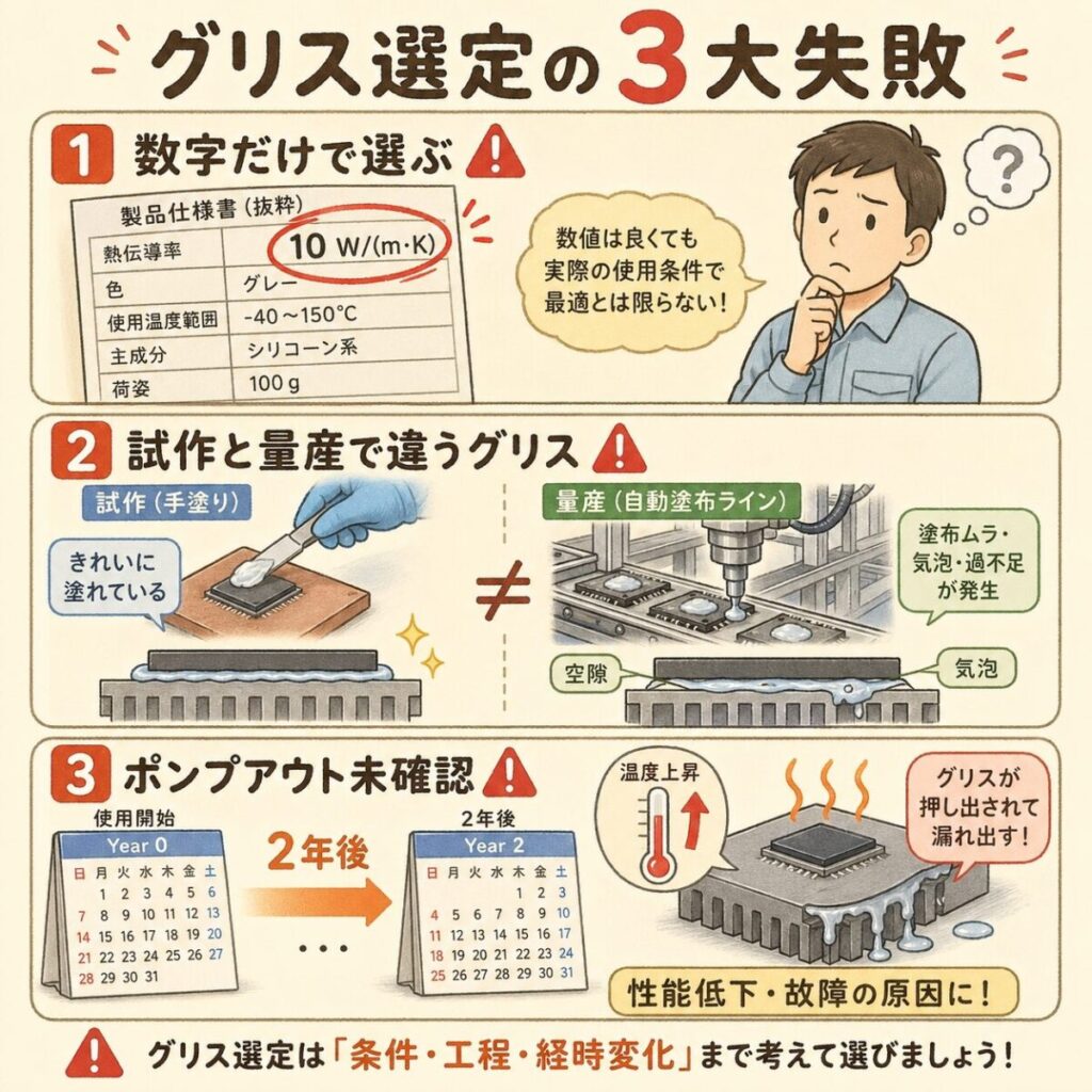 高性能グリスには「粘度が高くて塗布が難しい」「ポンプアウトで2年後に性能が落ちる」「導電性で絶縁箇所に使えない」など、カタログの熱伝導率だけでは見えない落とし穴があります。試作では冷えていたのに、量産品が客先で熱暴走——これは熱伝導グリスの選定ミスでよく起きる事故です。