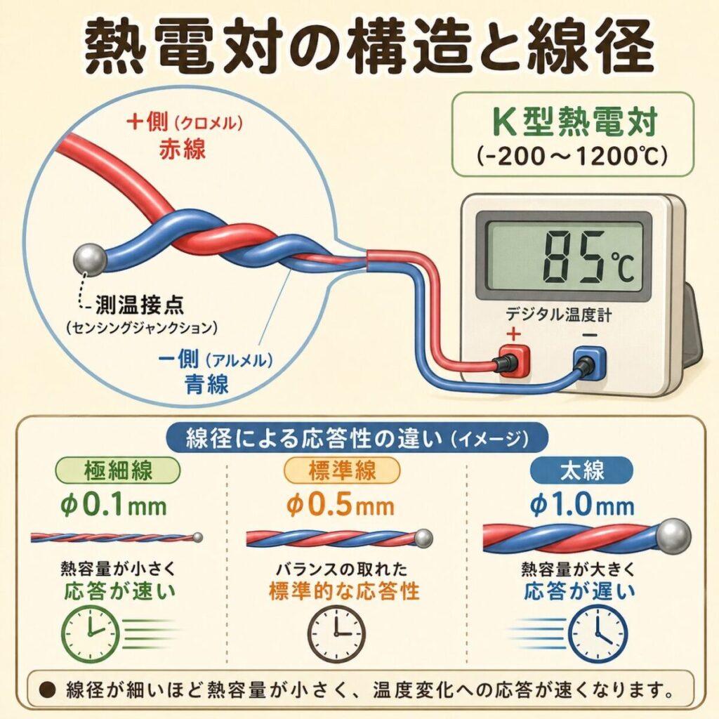 - 応答が速い:細いほど熱容量が小さく、温度変化に素早く追従