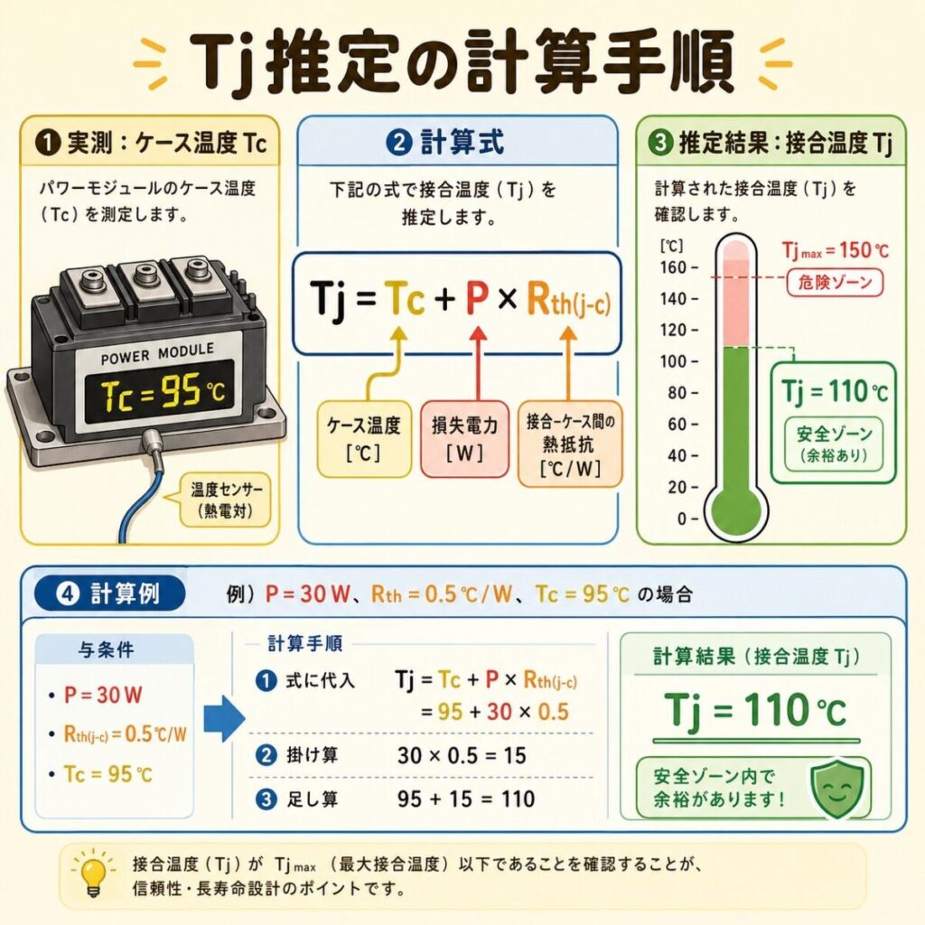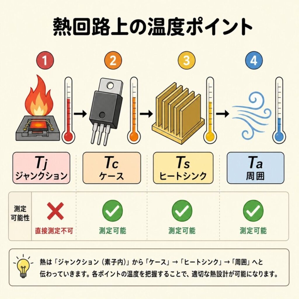 Tjは直接測定できません。パッケージの中にあるシリコンチップの温度なので、外部から触れません。実機検証では「Tcを測定→熱抵抗Rth(j-c)から計算してTjを推定」という流れになります。