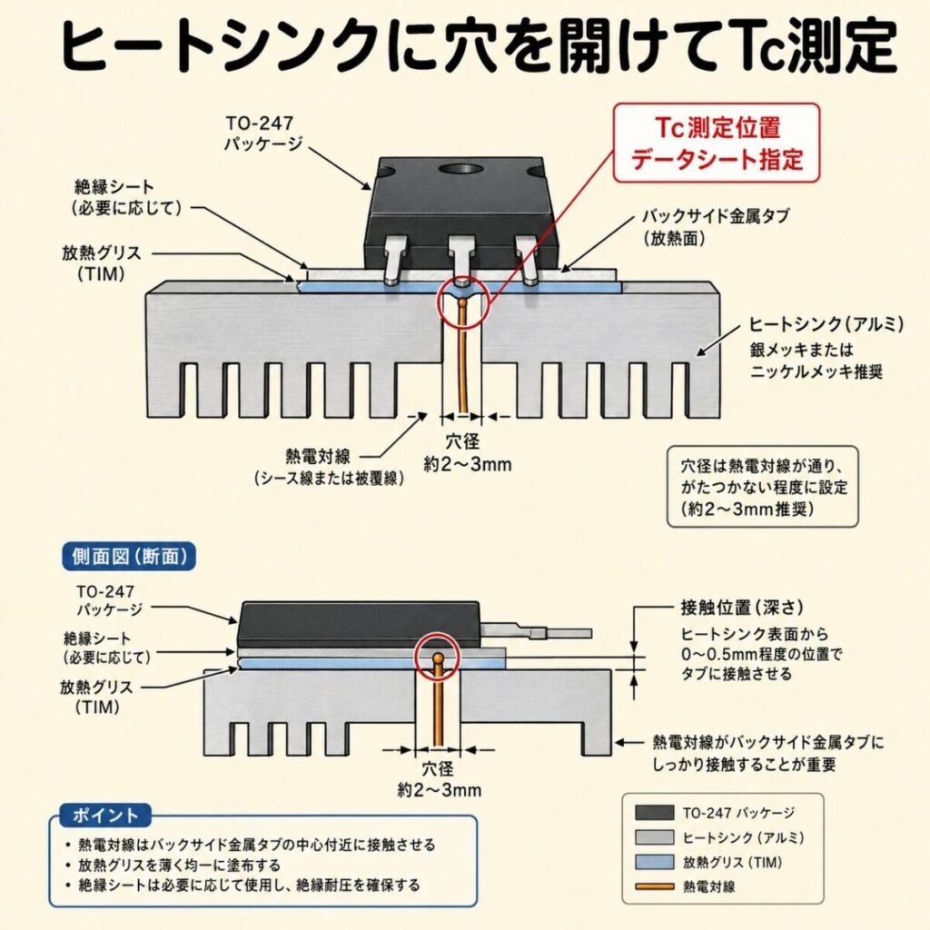 パッケージの放熱タブ側にヒートシンクを取り付けてしまうと、Tc測定位置にアクセスできません。実務的には2つの解決策があります。