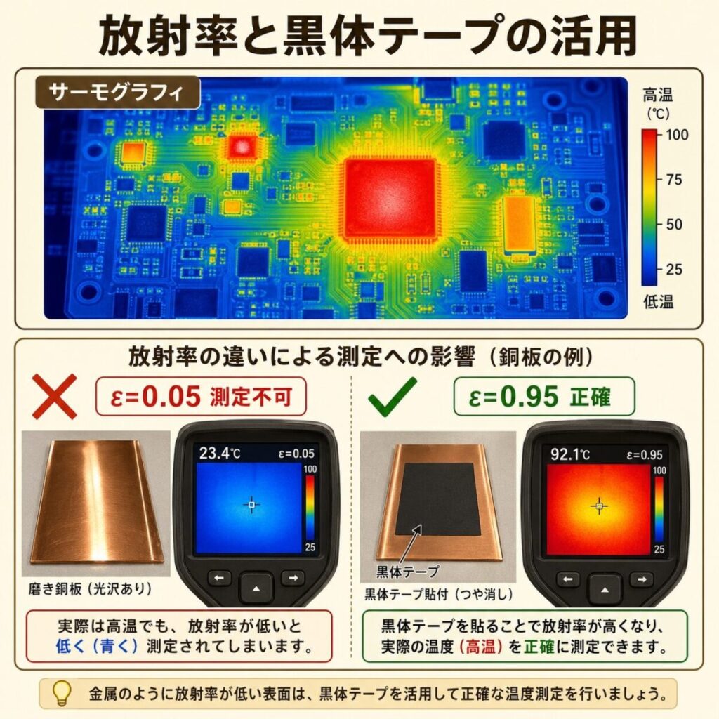 「赤外線カメラでヒートシンクを撮影したら表面が真っ青(=冷たい)に見えた。実は熱電対では80℃あった」というのは典型的な放射率エラーです。金属面を測るときは必ず黒体テープを貼るのがプロの常識です。