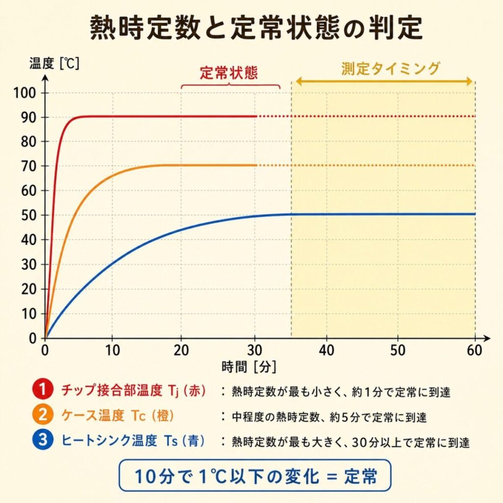 温度測定は「定常状態(熱平衡)」になってから読むのが基本です。動作開始直後はまだ温度が上昇中で、本当の最終温度ではありません。