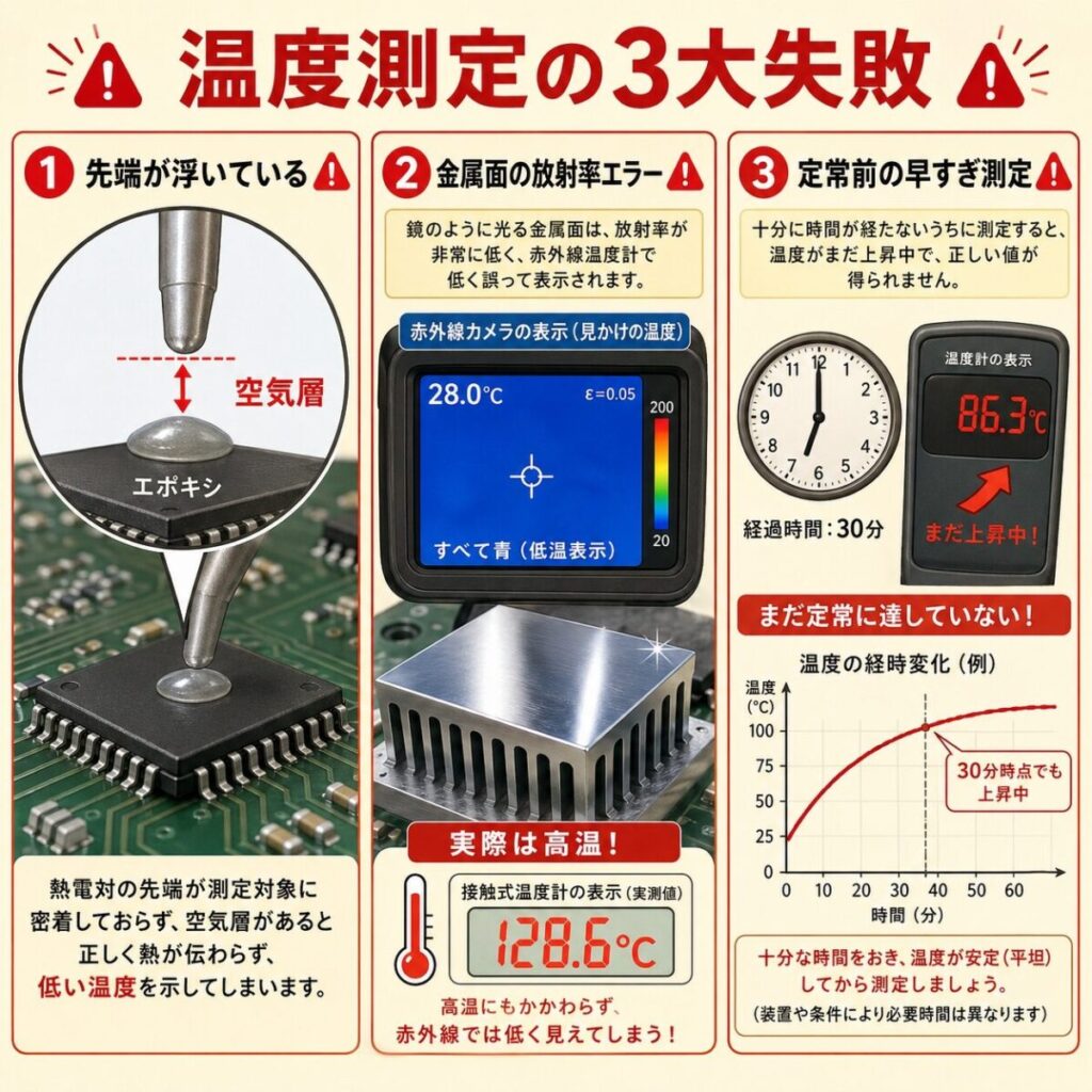 熱設計は「計算」と「実測」の両輪で完成します。どんなに緻密に計算しても、実機の組み立て公差・部品ばらつき・周囲環境の違いで結果は変わります。だから必ず実測で検証するのですが、温度測定は意外と難しく、間違った方法では真実が見えません。