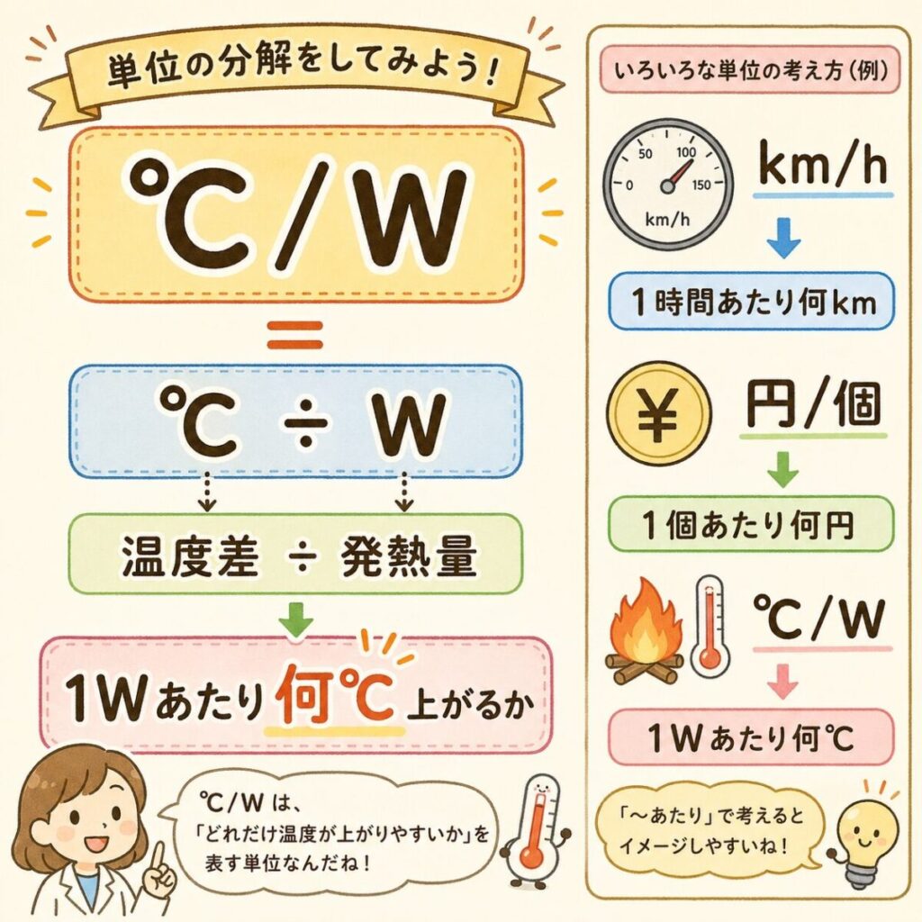 「℃/W」という単位は、声に出して読むと「ど、わっと」または「セルシウス度パーワット」です。でも読み方を覚えるより大事なのは、意味の理解です。