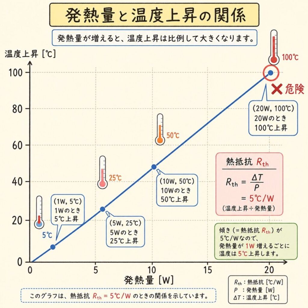 「同じヒートシンクで発熱量だけ2倍になったら、温度上昇も2倍」──これは熱設計の鉄則です。回路設計者から「この素子に変更したい、発熱が1.5倍になるけど」と言われたら、即座に温度上昇も1.5倍になると判断できる感覚を持ってください。
