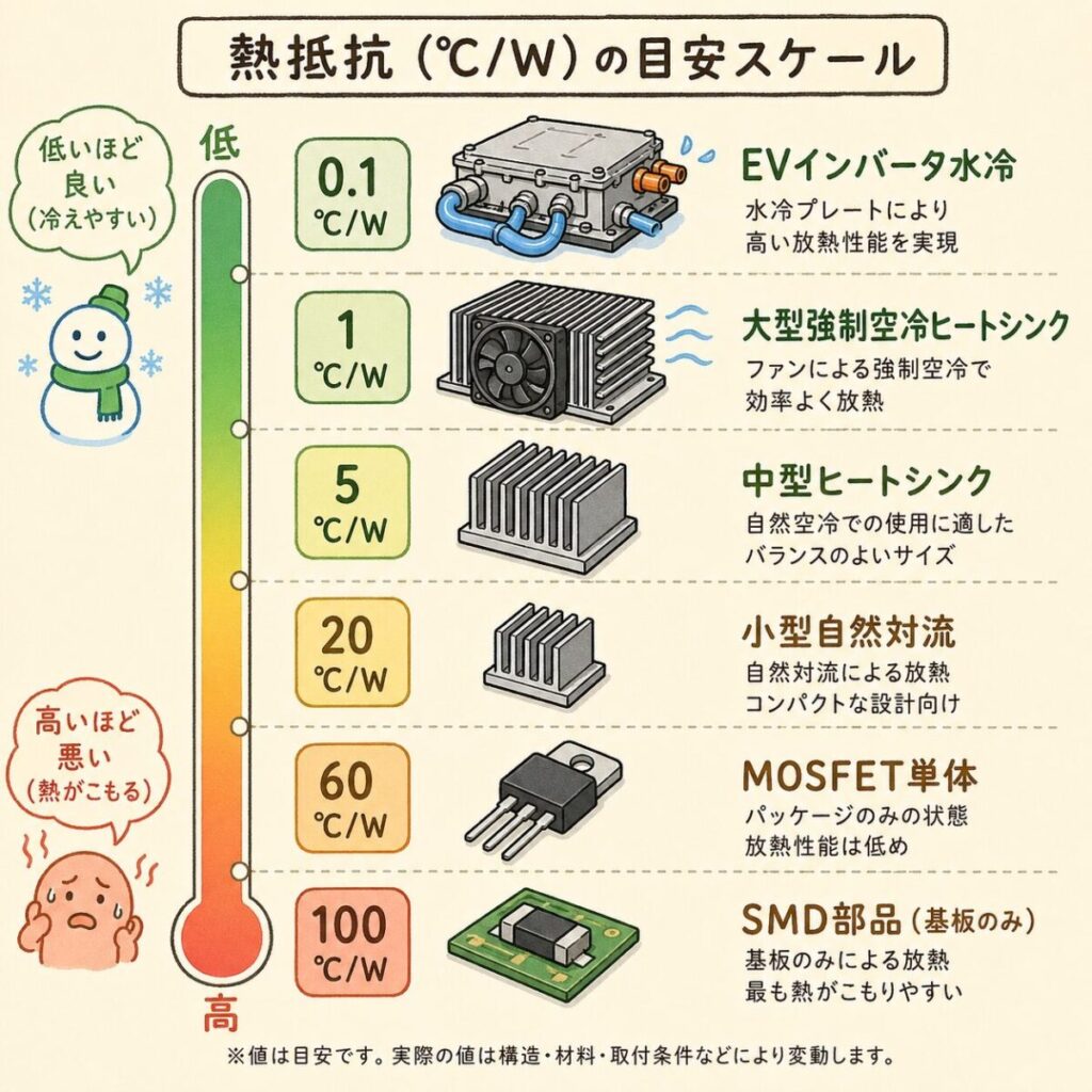 前回の記事で、熱抵抗が「電気のオームの法則とまったく同じ」だと解説しました。式は理解できても、実際に「Rth = 5 ℃/W」と書かれた数値を見て「で、それって熱いの?冷たいの?」と感覚がつかめない方は多いはずです。