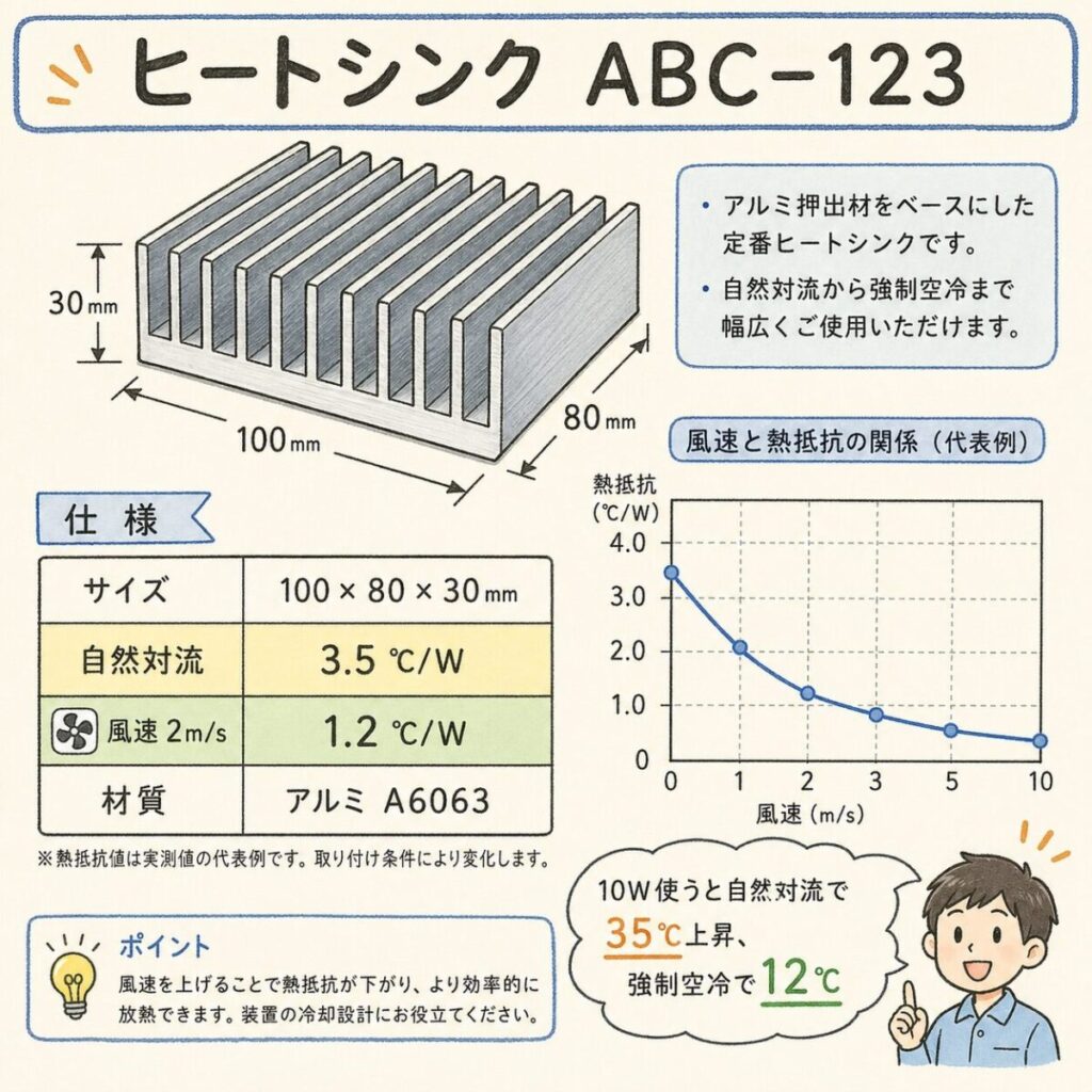 ヒートシンクのカタログには、必ず「熱抵抗」が書かれています。これを読めるようになると、選定が一気に楽になります。