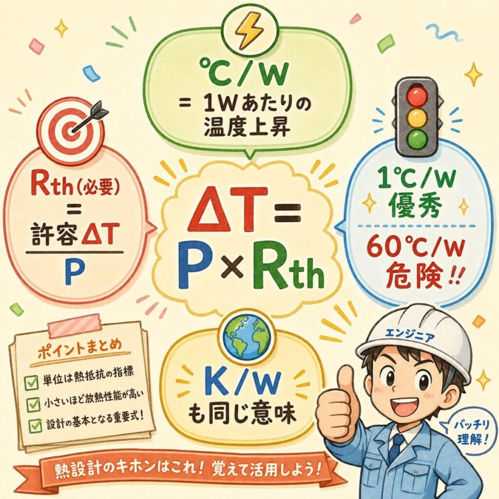 熱抵抗の単位「℃/W」が「1Wあたりの温度上昇」だと腹落ちすれば、熱設計のカタログやデータシートを見るのが楽しくなります。「これは冷えそう」「これは厳しい」という直感が育つと、設計レビューで即座に判断できるようになります。