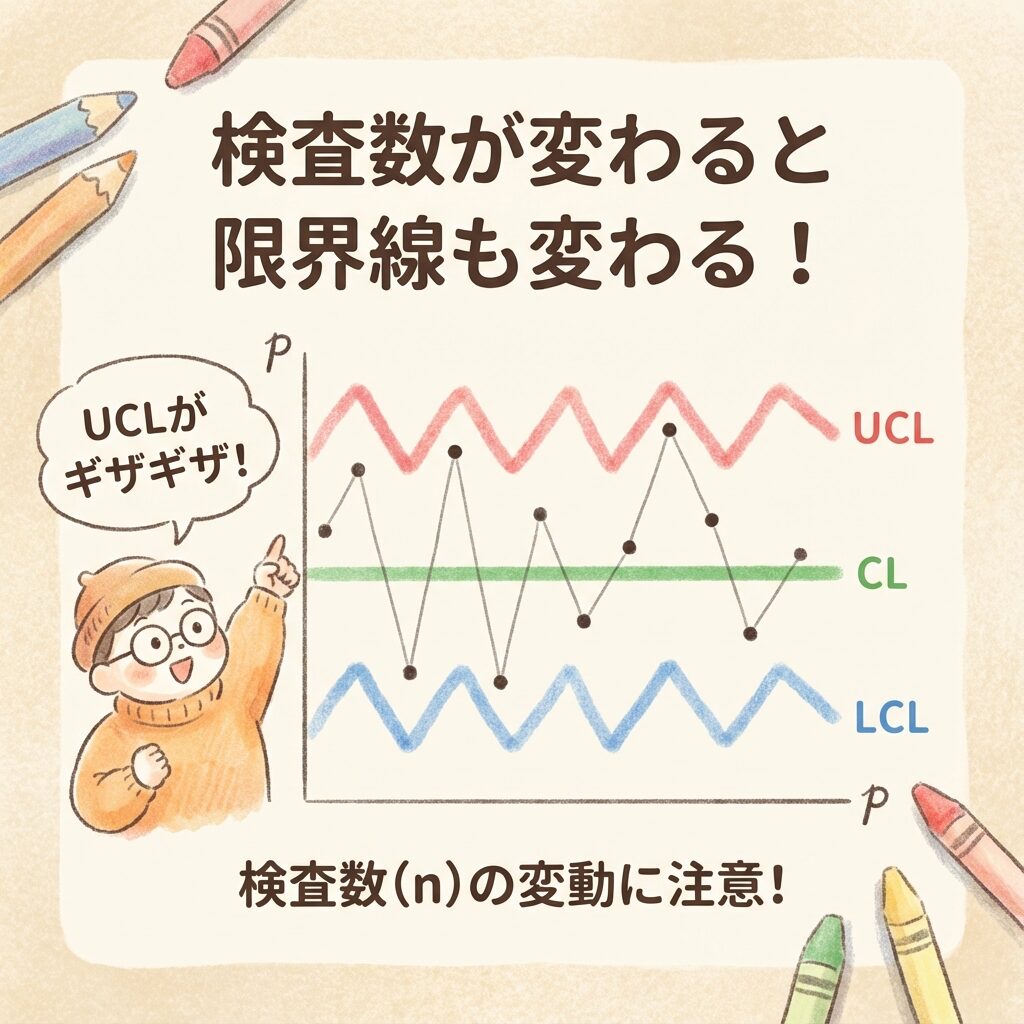 公式に「n」が含まれているので、検査数が変わるとUCL・LCLも変わります!