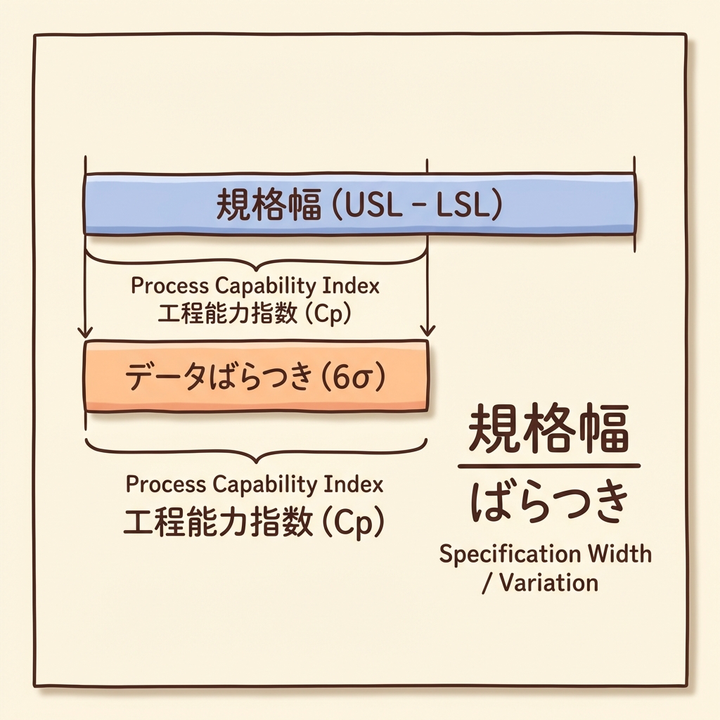 「規格の幅」が分子、「データのばらつき」が分母。つまり「入れ物の大きさ ÷ 中身の大きさ」です。入れ物に対して中身が小さければ数値は大きくなり(余裕あり)、中身がパンパンなら数値は小さくなる(余裕なし)。ただそれだけの話です。