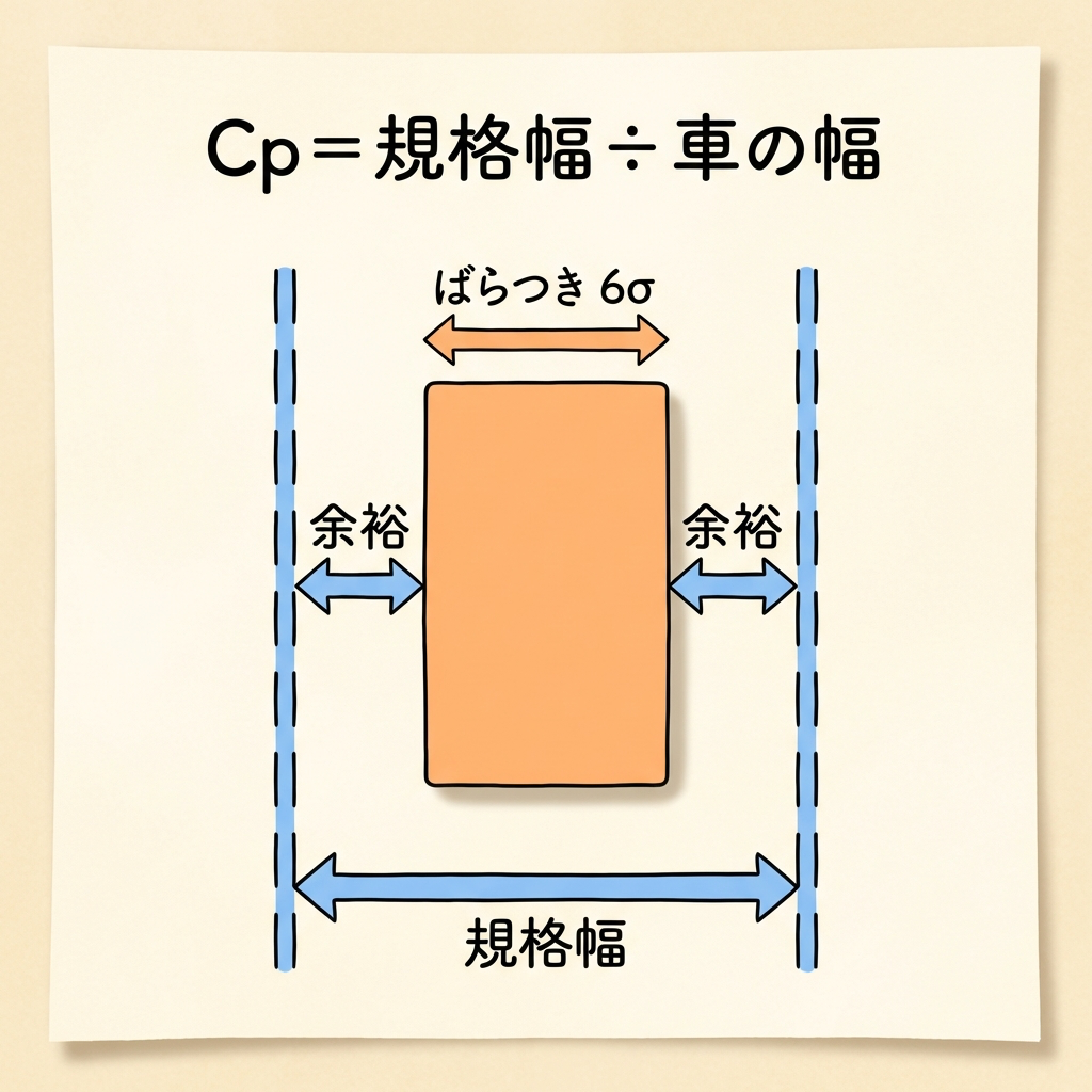 Cp(潜在能力) 駐車スペースの幅 ÷ 車の幅。中心のズレは無視。工程のポテンシャルだけを見る