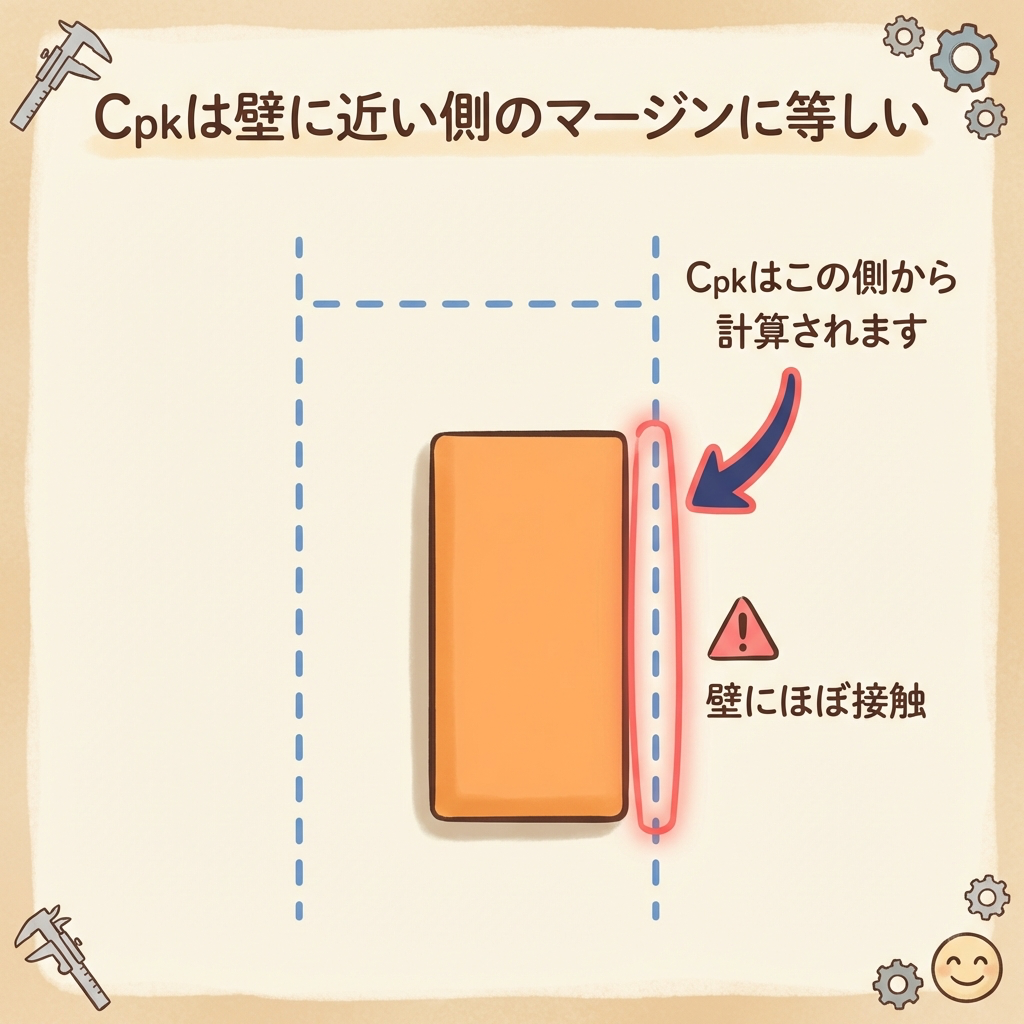 Cpk は"壁に近い側にどれだけ余裕があるか"を見る。片寄りも含めた実力値。