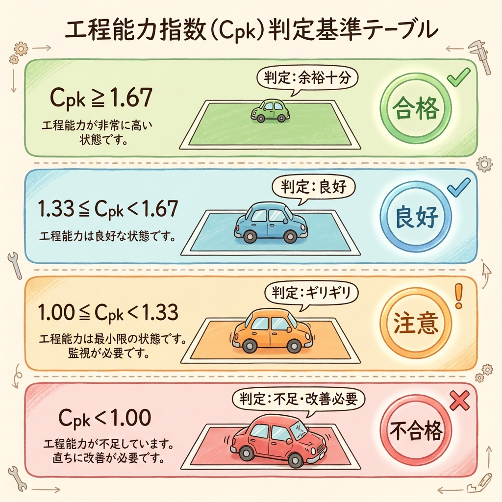 判定基準 Cpk ≧ 1.33 が多くの業界の合格ライン。1.00は規格ギリギリ、1.00未満は能力不足
