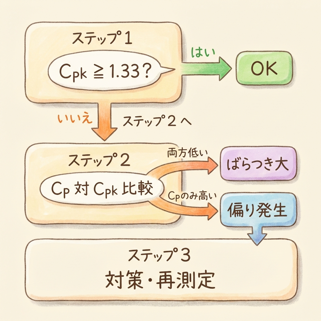 Cpk < 1.33 なら → ⚠️ 要改善。STEP 2へ。