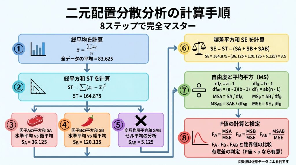 二元配置分散分析の計算手順(8ステップ)